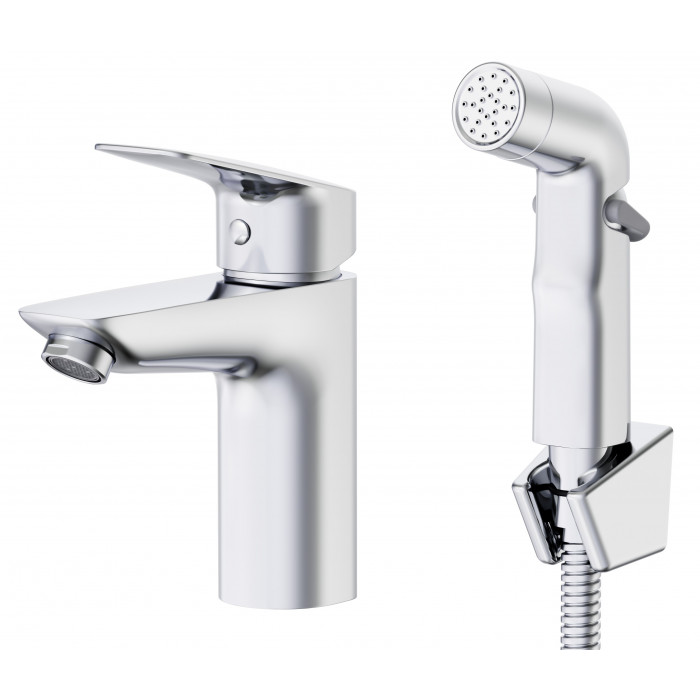 Комплектация (текст): смеситель, монтажный комплект, паспорт изделия, гибкая подводка, гиг. лейка, шланг, держатель.