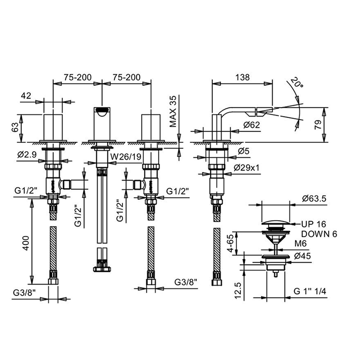 Смеситель для биде Fantini Venezia In 29 P9 N509S Медь Fantini Venezia In Смеситель для биде, 3 отв., с донным клапаном, излив 135мм, цвет: Matt Copper PVD