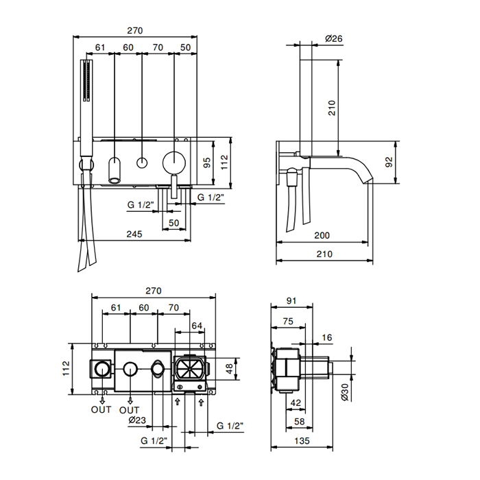 Смеситель для ванны Fantini Nostromo 50 13 E321B Черный матовый Fantini Nostromo Смеситель для ванны, встраиваемый, (наружняя часть), цвет: черный матовый