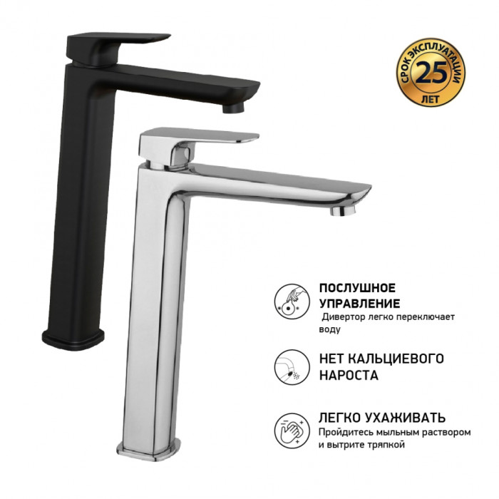 Выглядит стильно, матовый черный не маркий. Ход рычага плавный, напор регулируется точно. Из минусов - тяжёлый, пришлось аккуратно подтягивать крепеж.