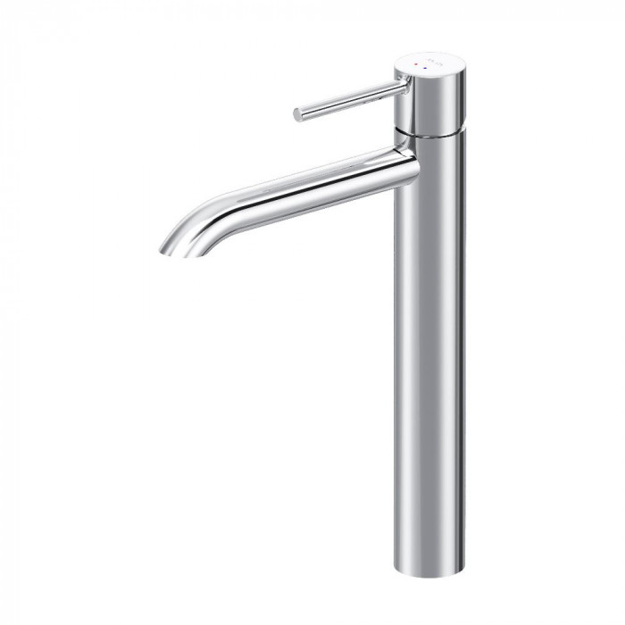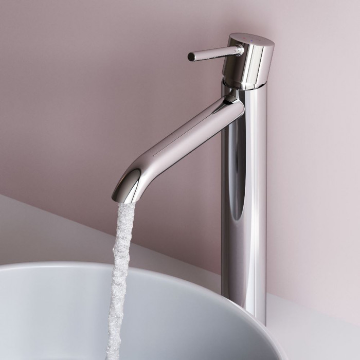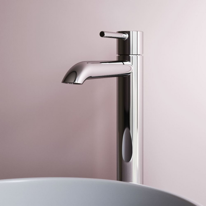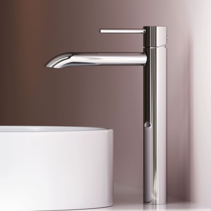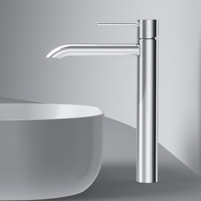 Характерный излив — ключевая особенность коллекции. Выверенный изгиб в сочетании с чистой горизонталью излива подчёркивает архитектурную чистоту формы. Такое решение требует высокой точности производства и формирует цельный, визуально безупречный силуэт. Высота излива идеально подходит для использования с накладными раковинами.