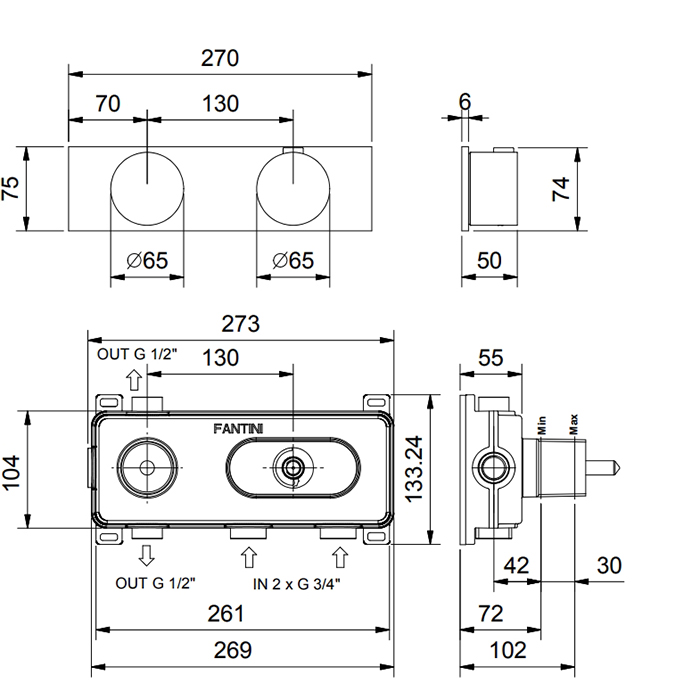 Смеситель для душа термостат Fantini AF/21 27 P5 A972B Gun metal FANTINI AF/21 Смеситель настенный встраиваемый, термостатический, с переключателем на 2 положения, цвет Matt Gun Metal PVD
