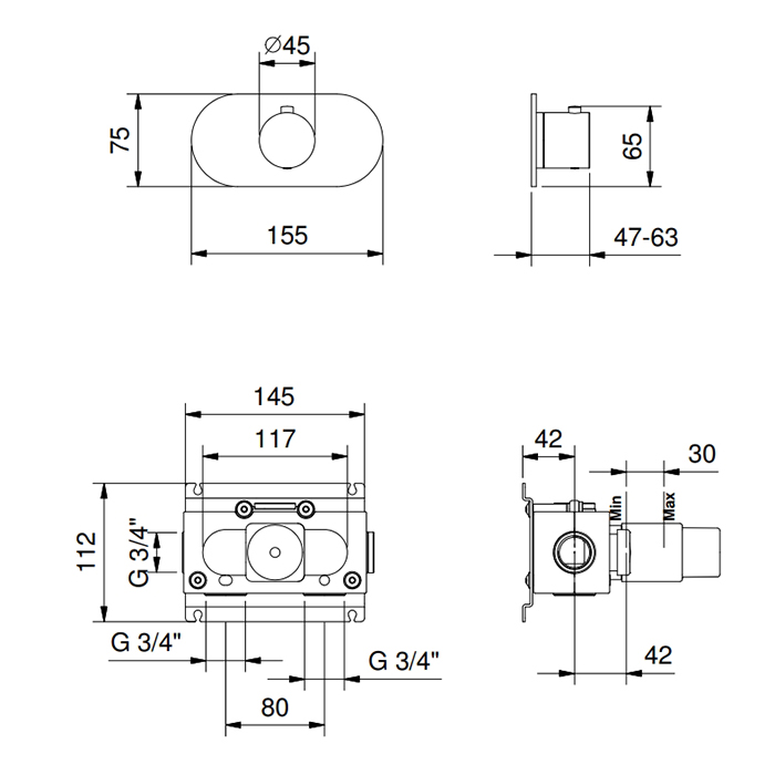 Смеситель для душа термостат Fantini Icona Classic 87 13 R700B Черный матовый FANTINI ICONA CLASSIC Смеситель настенный встраиваемый, термостатический, внешняя часть, цвет черный матовый