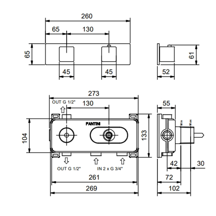 Смеситель для душа термостат Fantini Mint 34 02 F472B Хром Fantini Mint Встраиваемый термостат для душа на 2 потока, 3/4", (наружняя часть), цвет: хром