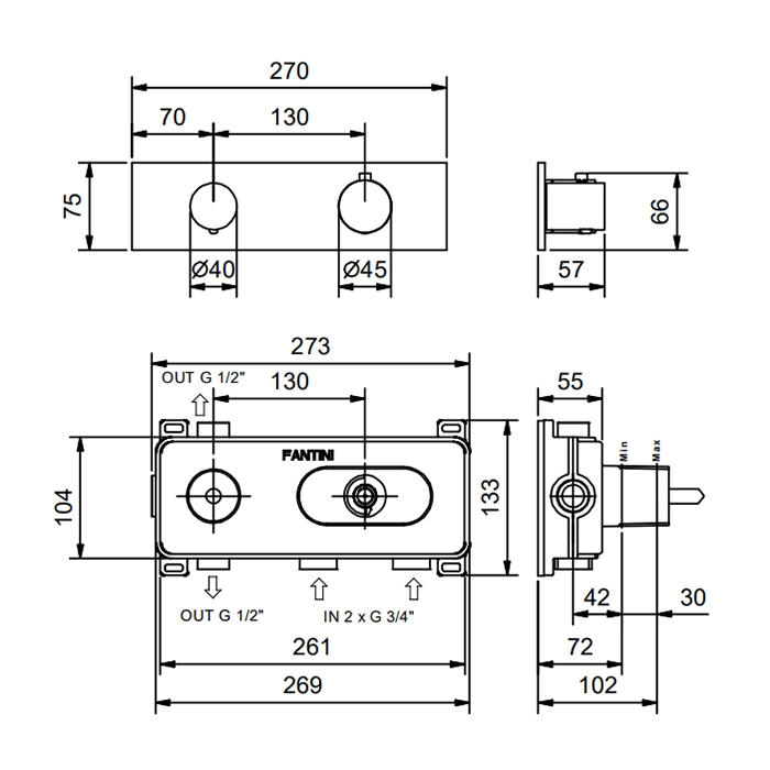 Смеситель для душа термостат Fantini Nostromo 87 P6 G572B Золото Fantini Nostromo Термостатический встраиваемый смеситель для душа на 2 потока , с поворотной ручкой, цвет Matt British Gold PVD