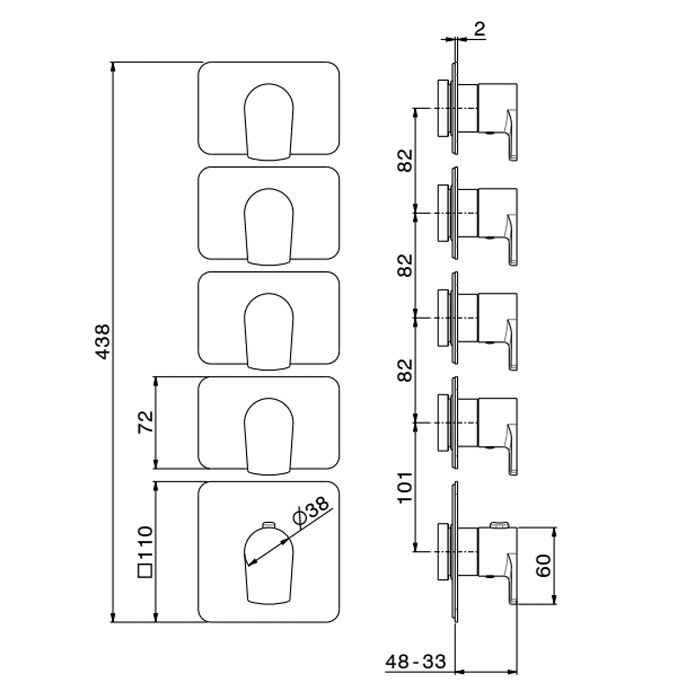 Смеситель для душа термостат Newform Haka 69872E.59.066 Нержавейка Newform Haka Внешняя часть термостатического смесителя на 4 источника с отдельными ручками запорного вентиля, цвет: PVD brushed stainless steel