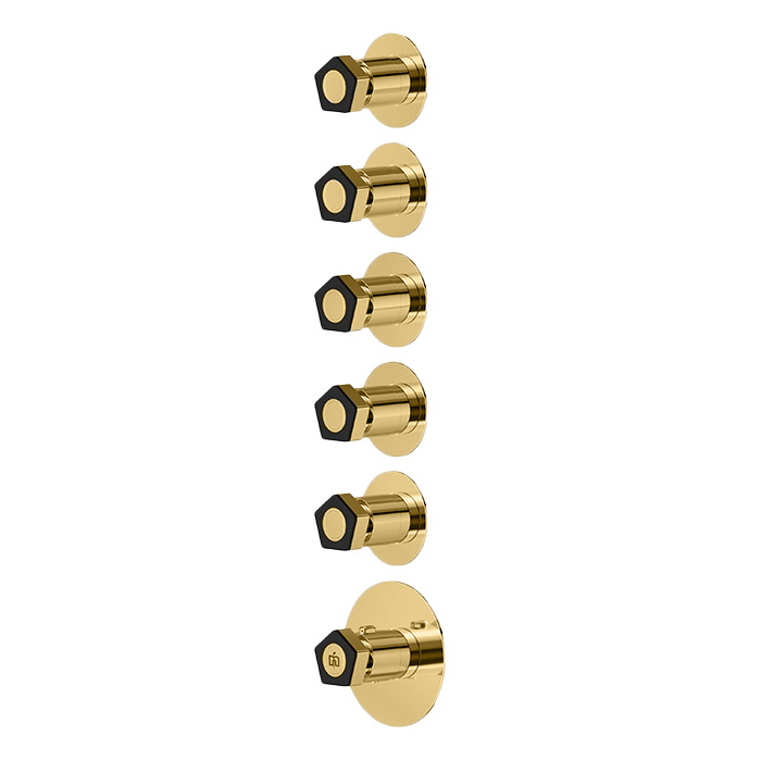 Смеситель для душа термостат Newform ParkLE 69802E.62.093 Золото Newform ParkLE Внешняя часть термостатического смесителя на 5 потоков с отдельными ручками запорного вентиля, цвет: PVD glossy gold + черный матовый