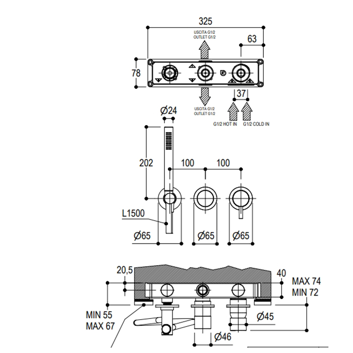 Смеситель встраиваемый однорычажный Ritmonio Diametro35 PR52GG201IX Нержавейка Ritmonio Diametro35 S Смеситель встраиваемый однорычажный, для ванны/душа, на 2-3 источника, внешняя часть (для встр. части PM0020L), цвет: Brushed
