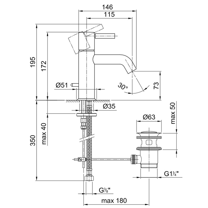 Смеситель для раковины Fantini Nostromo 50 02 E804F Хром Fantini Nostromo Смеситель для раковины, 1 отв., с донным клапаном, излив 115мм, цвет: хром