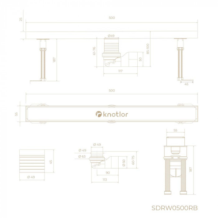 Душевой трап линейный Knotlor SDRW0500RB бронза Линейный трап с двухсторонней декоративной решеткой в цвете бронза с элегантным современным дизайном. Оснащен сухим затвором и комплектом для надежного монтажа. Китай 10 лет 7930139834968