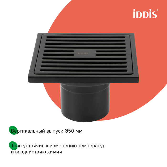 Трап душевой, вертикальный выпуск, сухой затвор, 10х10см, матовый черный, IDDIS, 980CV10BL3DDZ