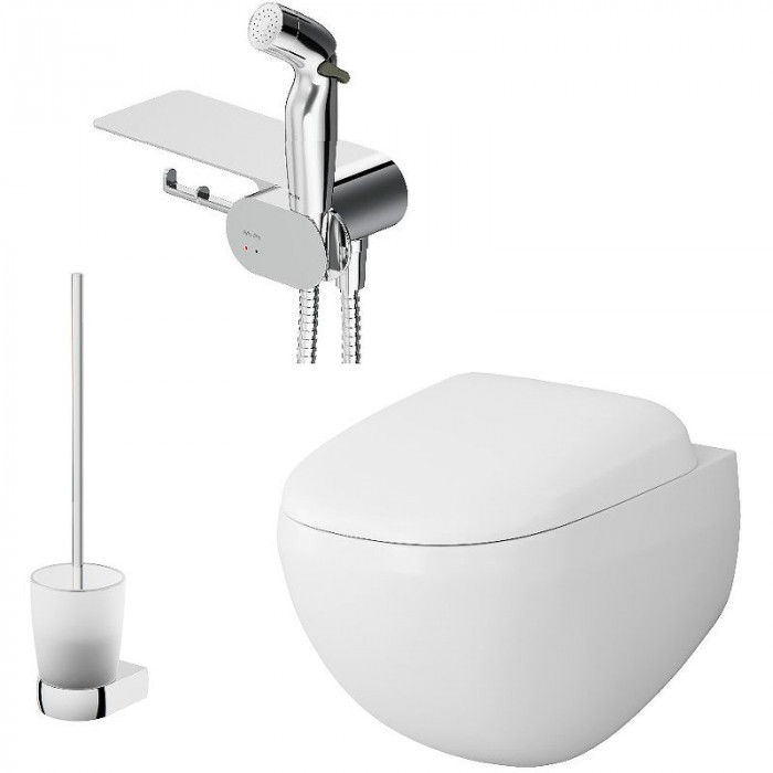 Полностью готовый к установке комплект: подвесной унитаз FlashClean сиденье для унитаза микролифт гигиенический набор с полкой cтойка с туалетной щеткой.