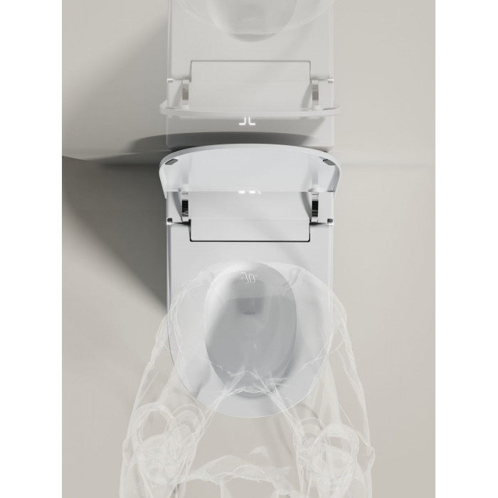 Модель оснащена автоматической крышкой. Она открывается при приближении пользователя и закрывается после использования. Это исключает контакт с поверхностью и повышает гигиеничность.