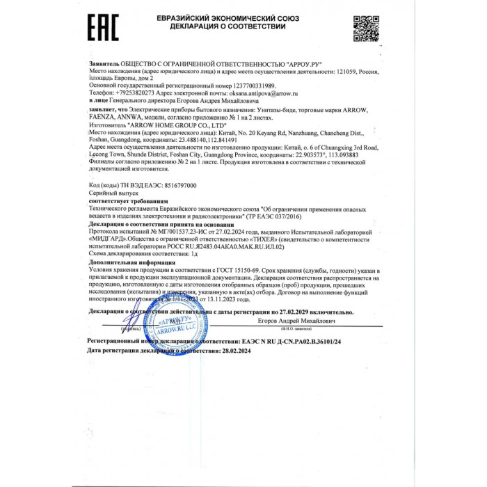 Унитаз подвесной ARROW AKH1051H со смарт функциями, белый