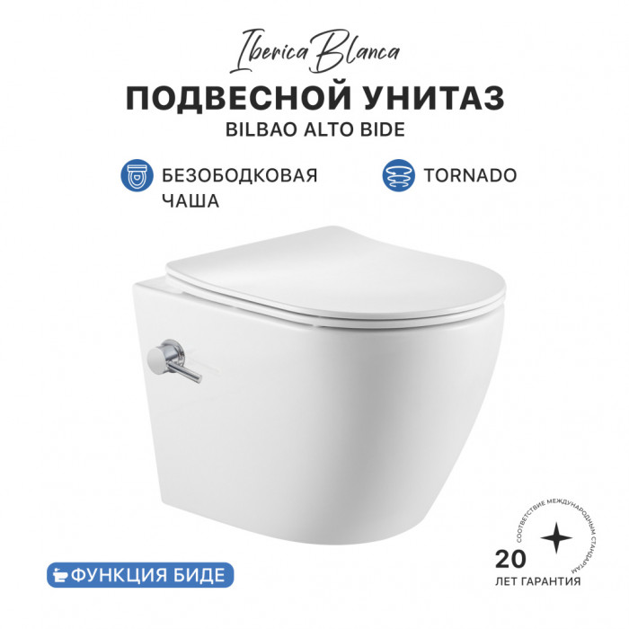 Унитаз подвесной IBERICA BLANCA BILBAO ALTO BIDE Tornado с функцией биде, белый (IB.BLA.234.1B1B) IBERICA BLANCA IB.BLA.234.1B1B 20 лет Испания