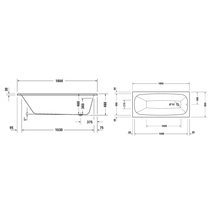 Ванна, Duravit, Aurena, ширина, мм-1800, глубина, мм-800, высота, мм-460, водоизмещение (л)-143, тип установки-встраиваемый/пристенный, форма-прямоугольная, слив-перелив-необходимо заказать, диаметр слива, мм-52, ножки-необходимо заказать, количество спинок-1, материал-композит, DuroCast Smooth, цвет-белый матовый