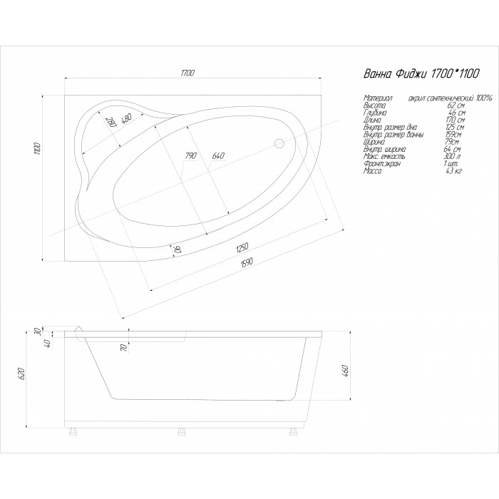 Акриловая ванна Aquatek Фиджи 170x110 асимметричная, правая, с каркасом и экраном FID170-0000005 белый 100 % литьевой сантехнический акрилл 20 лет Россия • Ванна без гидромассажного оборудования