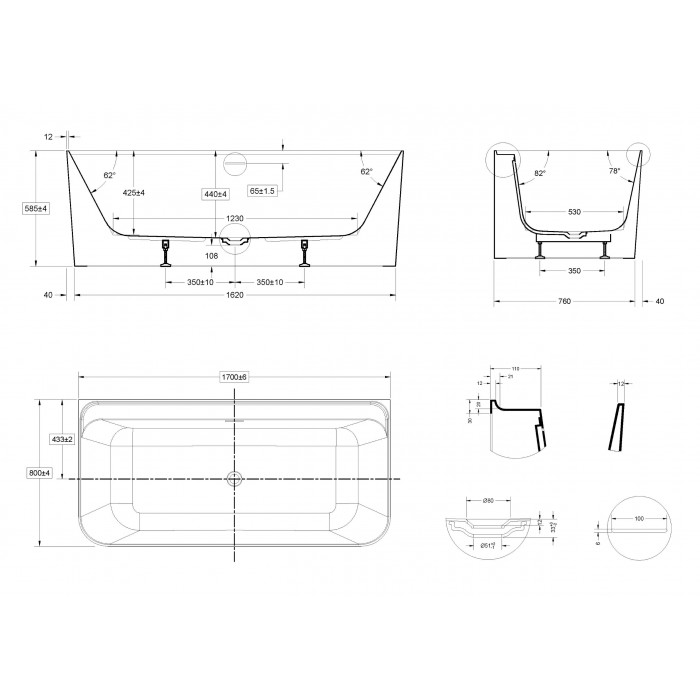 Ванна акриловая 170х80 см Vincea VBT-702-1700, цвет белый, щелевой перелив