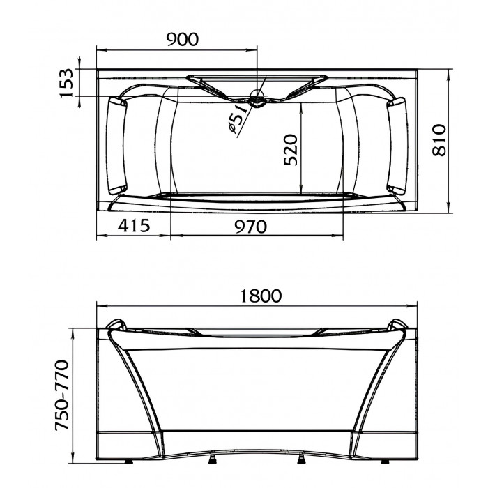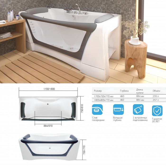 Особенностью данной модели является слив посередине купели, что позволяет максимально комфортно принимать ванну. Большая глубина ванны обеспечивает полное погружение в теплую воду и уменьшает количество брызг.