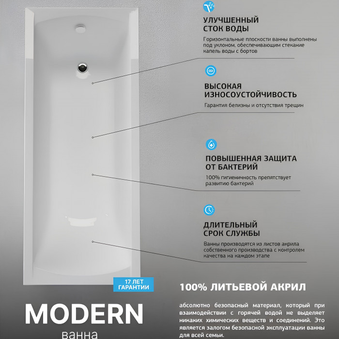 Выбирая акриловую прямоугольную ванну Marka One MODERN от производителя 1Марка, вы получаете не только стильный и функциональный элемент интерьера, но и гарантию качества и долговечности на 17 лет.