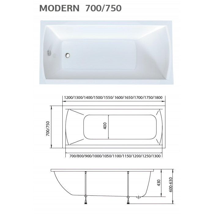 Ванна представлена в размерах от 120 до 190 см, поэтому она актуальна как для совсем небольших, так и для просторных ванных комнат.