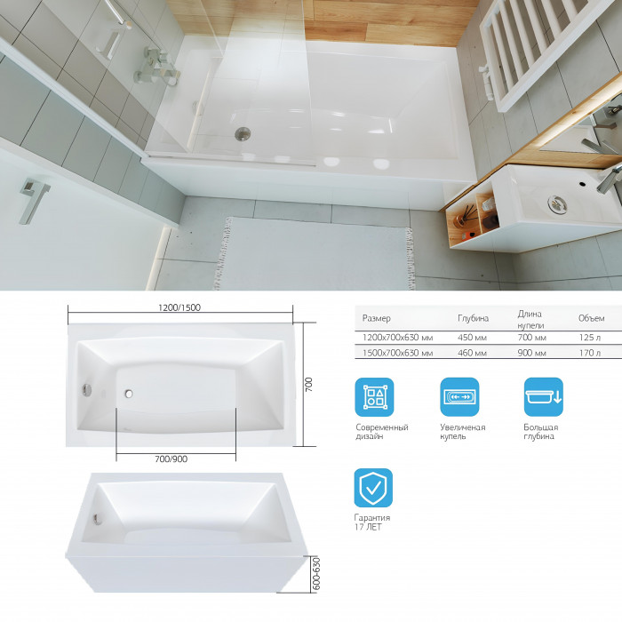 Ванна Marka One VIOLA имеет два размера - 120 и 150 см, что позволяет выбрать оптимальный вариант для вашего пространства. Объем чаши обеспечивает комфортное принятие ванны для одного человека.
