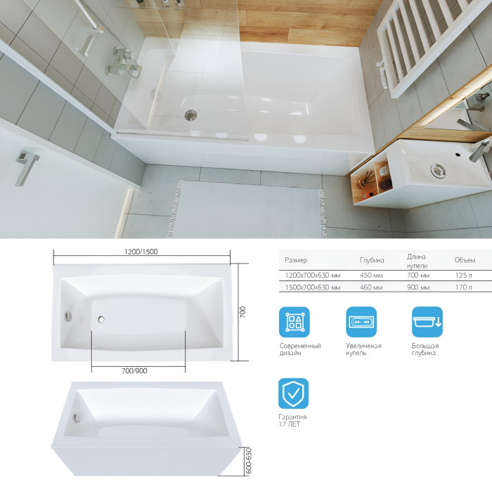 Ванна Marka One VIOLA имеет два размера - 120 и 150 см, что позволяет выбрать оптимальный вариант для вашего пространства. Объем чаши обеспечивает комфортное принятие ванны для одного человека.