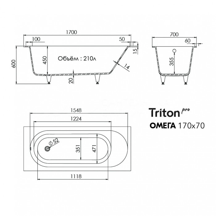 Ванна из искусственного камня Triton Омега Щ0000067077 170x70 см, на ножках
