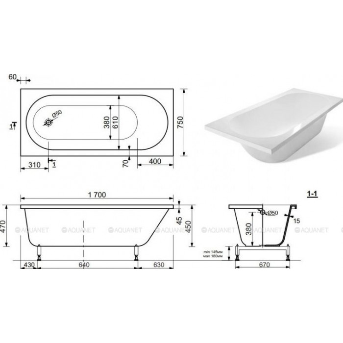 Ванна из искусственного мрамора Aquanet Lotos Stone 170x75 AQ-00332891