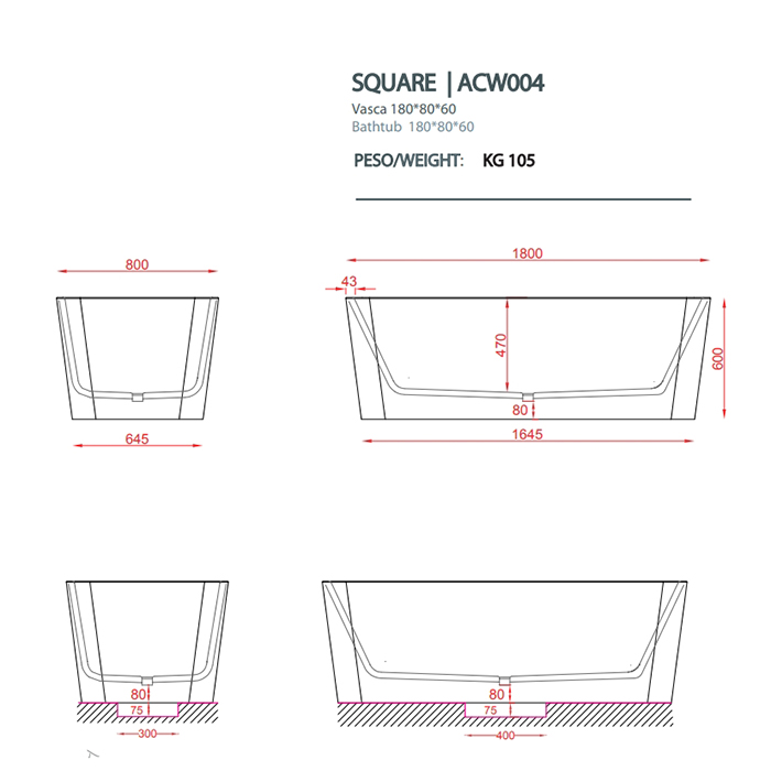 Ванна отдельностоящая 180х80 Artceram Square ACW004 05 bi matt Белый матовый Artceram SQUARE Ванна отдельностоящая, 180х80хh60см, с переливом и слив.крышкой, Livingtec (с сифоном ACA062), цвет: белый матовый