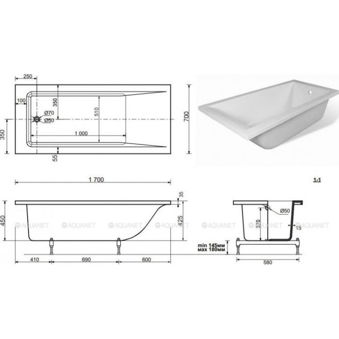 Ванна из искусственного мрамора Aquanet Bright Stone 170х70 AQ-00332880